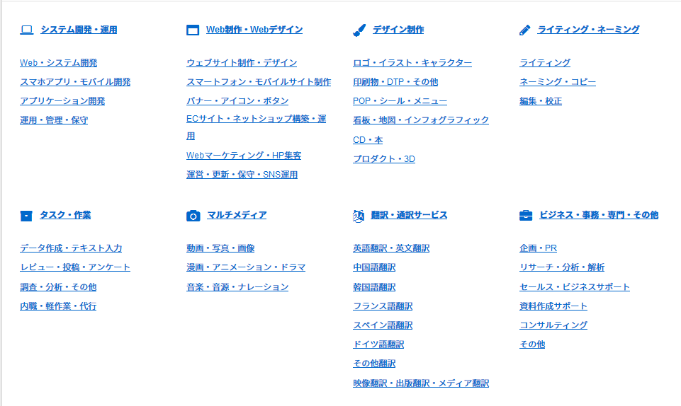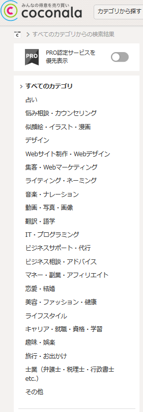 この中でカテゴリ分類が一番細かいのがココナラなのですが、どんな副業が自分にできるかサッパリわからん!という方はココナラの小カテゴリを見てみるといいです。