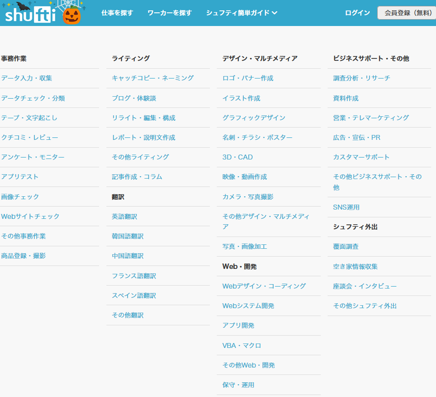 これはそれぞれココナラ、ランサーズ、シュフティといったクラウドソーシングサービスでの仕事のカテゴリ。