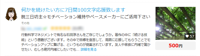 このサービスでは自分が頑張りたいこと(ダイエットやブログ更新、SNS絶ち、早寝早起きなど)と具体的目標を出品者に伝え、応援や見守りのメッセージを送ってくれるというもの。
