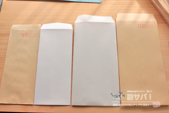 左2つが長4、右が長3ですね。コピー用紙はキレイな白ではないのがちょっと残念ですが、特にアルバイトであればこれくらいでも全く問題ありません。