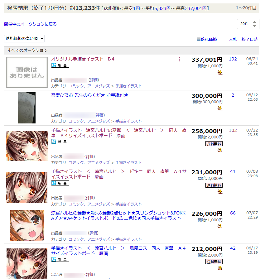 なので、必然的に手描きイラストが欲しい人もヤフオクを見るようになり、結果として手描きイラストのほとんどがヤフオクで取引されているのが現状です。