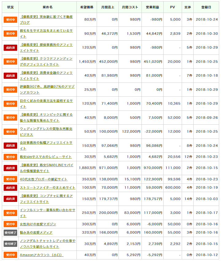 以下はサイト売買を仲介しているサイトでの販売サイトの一覧ですね。